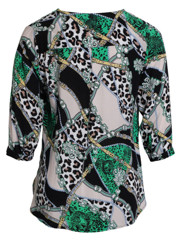 Blouse fluide imprimé foulard très tendance, avec un soufflet sur l’avant et deux revers au col agrémenté d’un bouton.