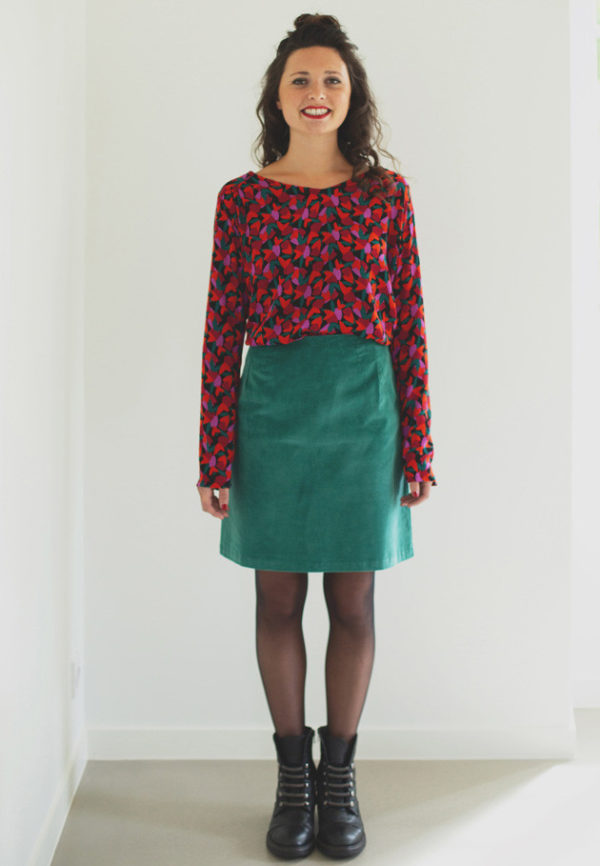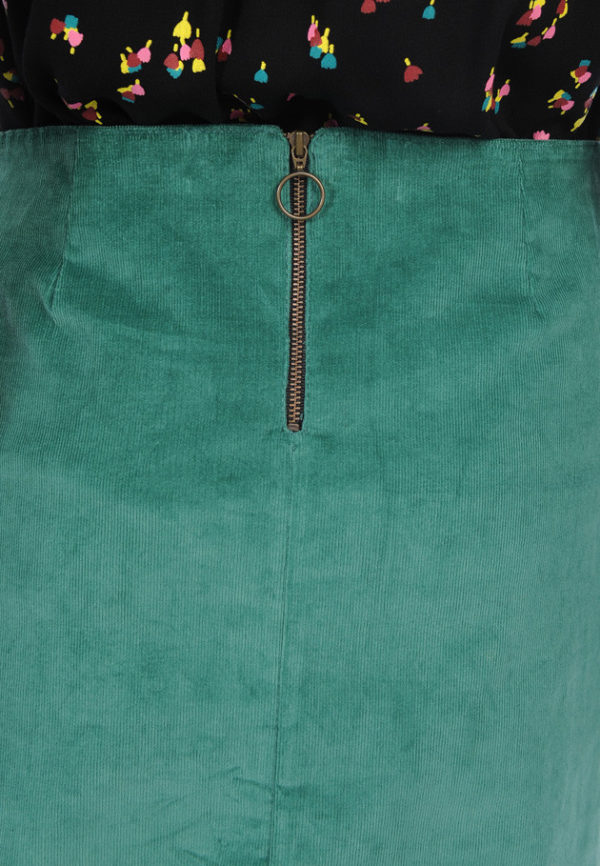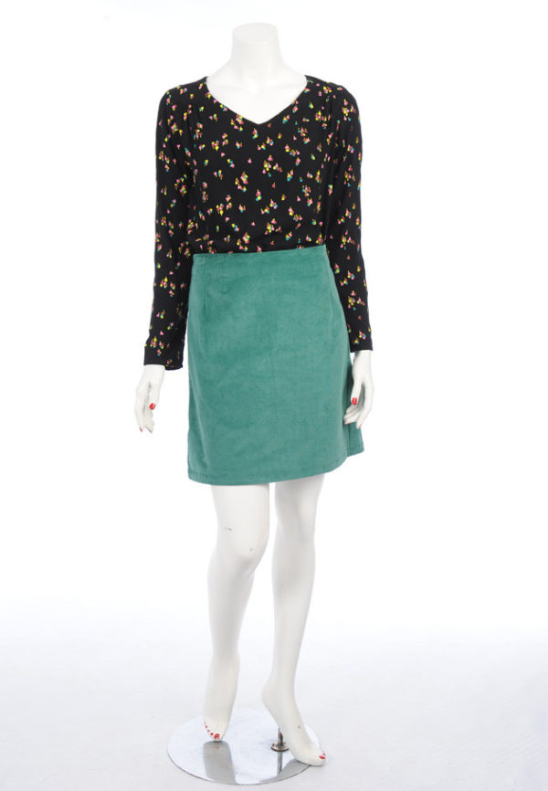 Jupe en velours vert avec 4 pinces sur l’avant et sur l’arrière.