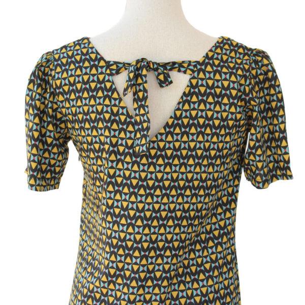 Robe coupe droite avec un joli imprimé bleu jaune et noir.