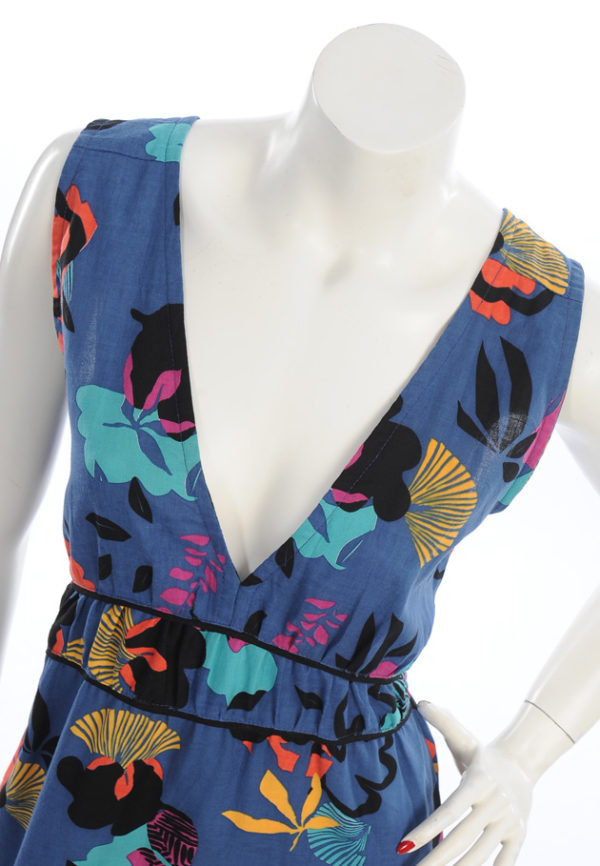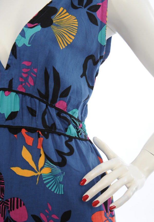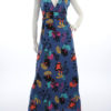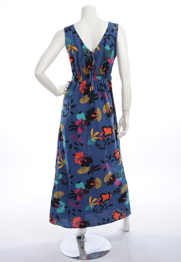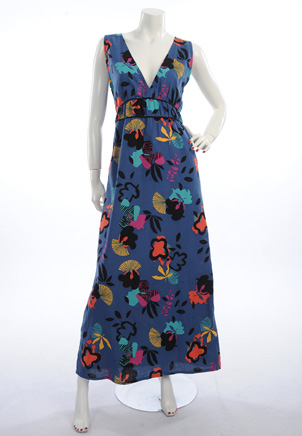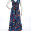 Robe longue imprimé coloré sur fond bleu.